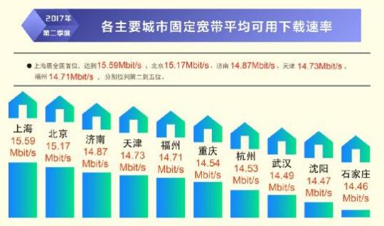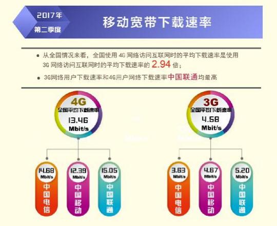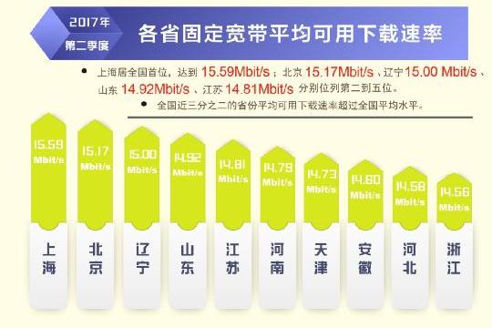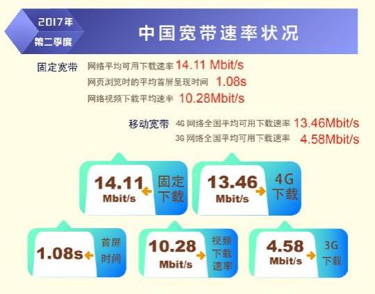 日前,寬帶發(fā)展聯(lián)盟發(fā)布了第 16 期《中國寬帶速率狀況報告》(2017 年第二季度)。報告顯示 2017 年第二季度我國固定寬帶網(wǎng)絡平均下載速率達到 14.11Mbit/s,比 2017 年第一季度提高了1.1Mbit/s,同比去年第一季度提升了 34.8%。自 2015 網(wǎng)絡“提速降費”工作開展以來,我國固定寬帶可用下載速率連續(xù) 10 個季度持續(xù)提升,總提升幅度達到 3.3 倍。同時,我國移動寬帶用戶使用 4G 網(wǎng)絡訪問互聯(lián)網(wǎng)時的平均下載速率達到 13.46Mbit/s,環(huán)比 2017 年第一季度也有 14.2%的提升。